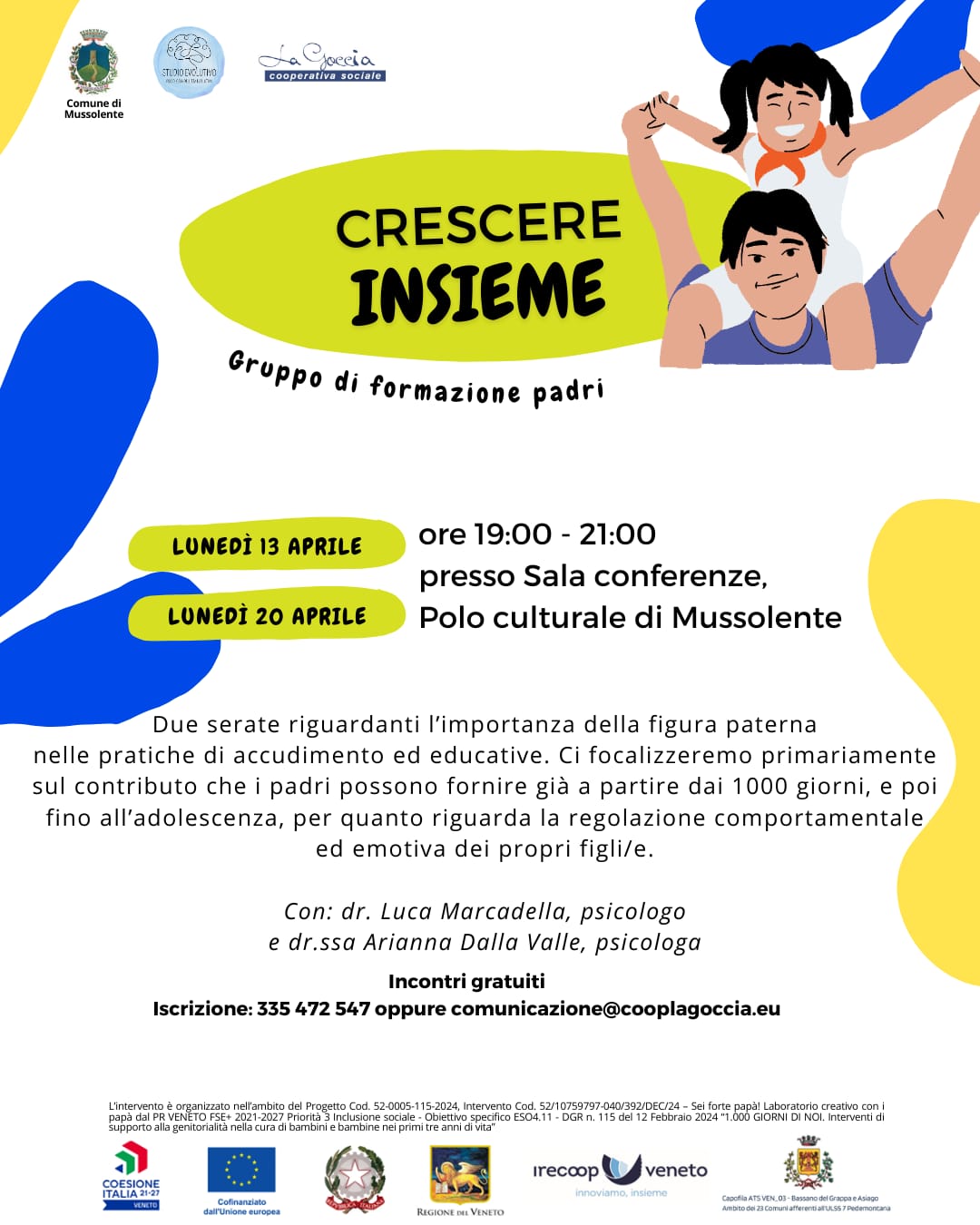 Il Comune di Mussolente e la Cooperativa La Goccia organizzano due incontri, nell'ambito del progetto della Regione Veneto "Mille giorni" dedicati ai padri.