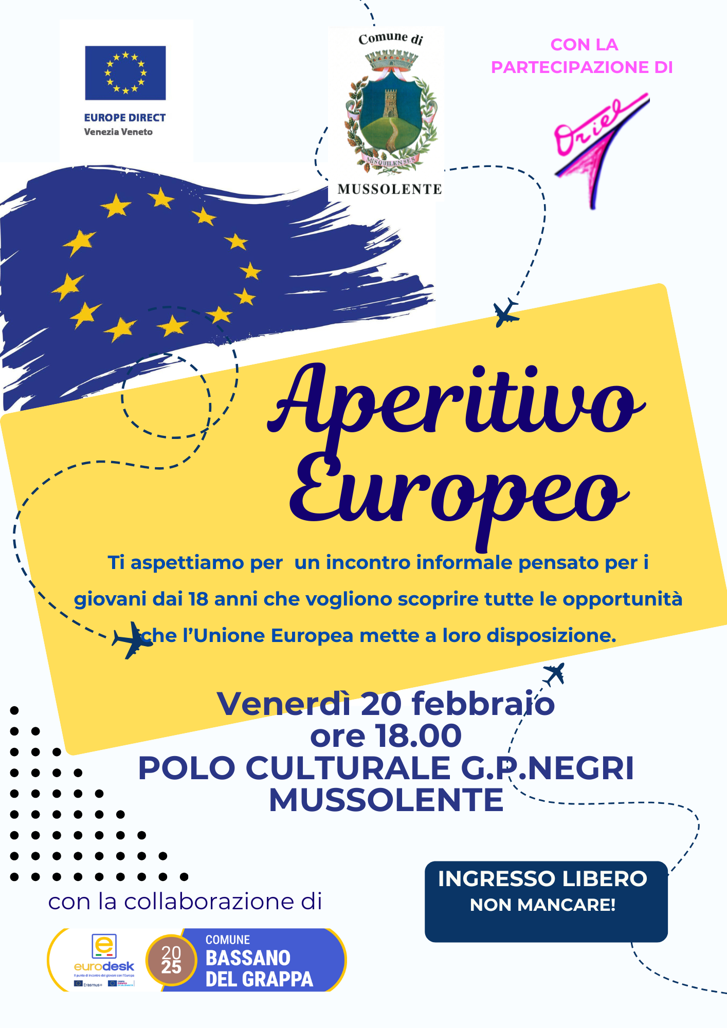 Ti aspettiamo per l'Aperitivo Europeo, un incontro informale pensato per i giovani dai 18 anni che vogliono scoprire tutte le opportunità che l’Unione Europea mette a loro disposizione.