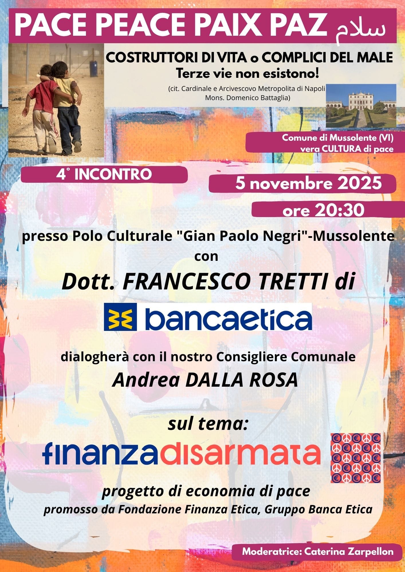 Prosegue il percorso di approfondimento dedicato alla cultura della pace promosso dal Comune di Mussolente. Ospite della serata sarà il Dott. Francesco Tretti di Banca Etica, che dialogherà con il consigliere comunale Andrea Dalla Rosa sul tema: “Finanza disarmata: progetto di economia di pace”, iniziativa promossa da Fondazione Finanza Etica e Gruppo Banca Etica, nata per promuovere un uso responsabile del denaro e contrastare gli investimenti che alimentano conflitti e industrie belliche.